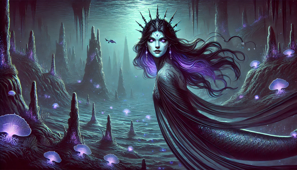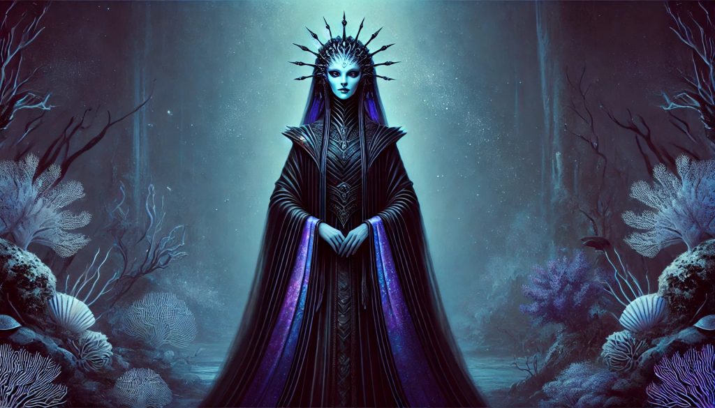 Though her realm lies far below the shimmer of coral cities and starlit domes, her influence ripples upward through tectonic memory and oceanic stillness. She governs the Deep Trenches — vast, dark regions where matter compresses into memory and forgotten souls settle like sediment.