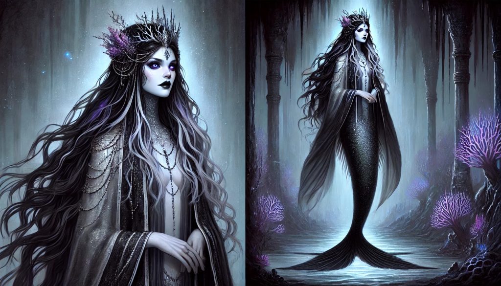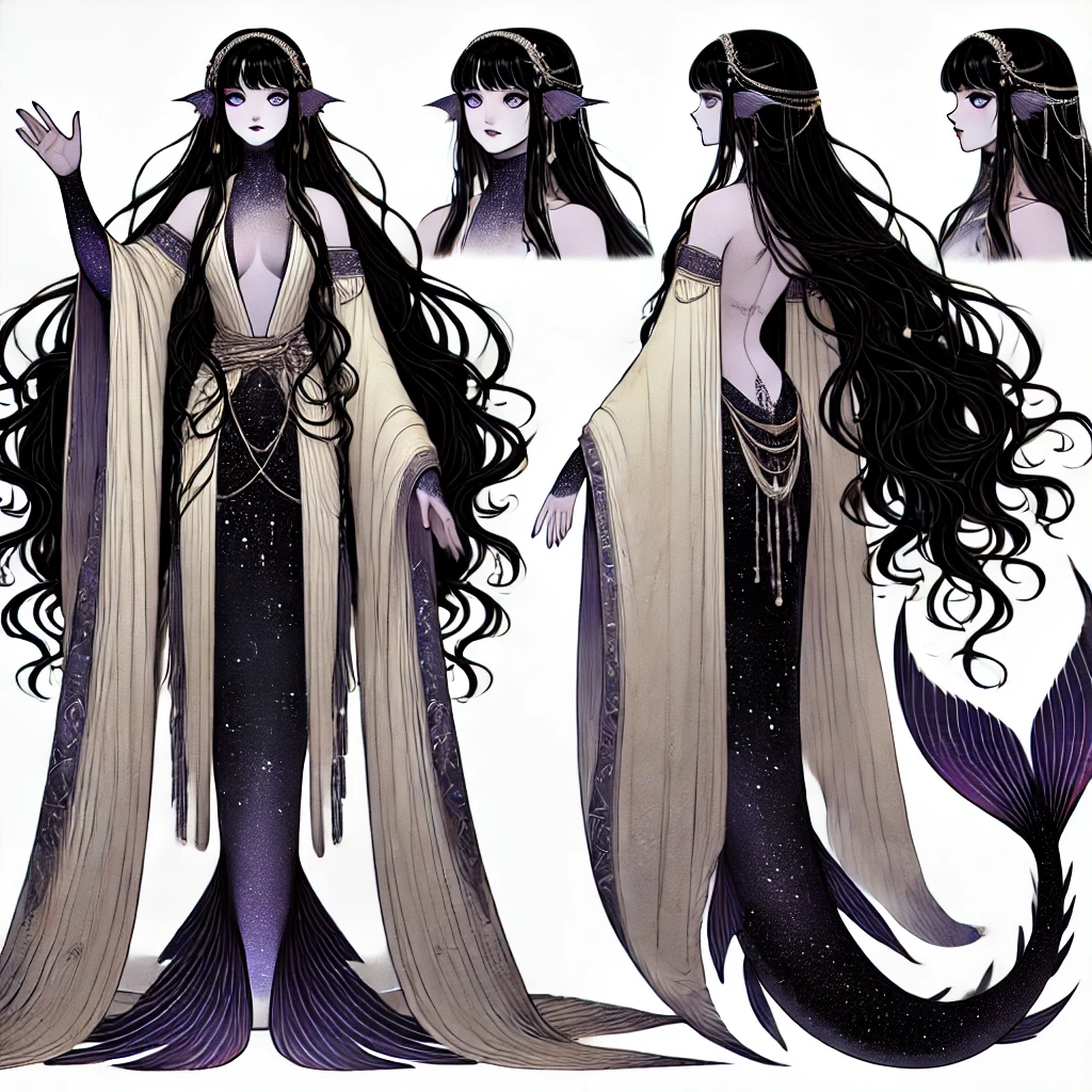 - Her mer-tail is a sleek obsidian black with hints of iridescence, designed for silent swimming and coiling like shadow. Her mer-tail boasts a jet-black finish with opal iridescence and ripple fins that seem to whisper.