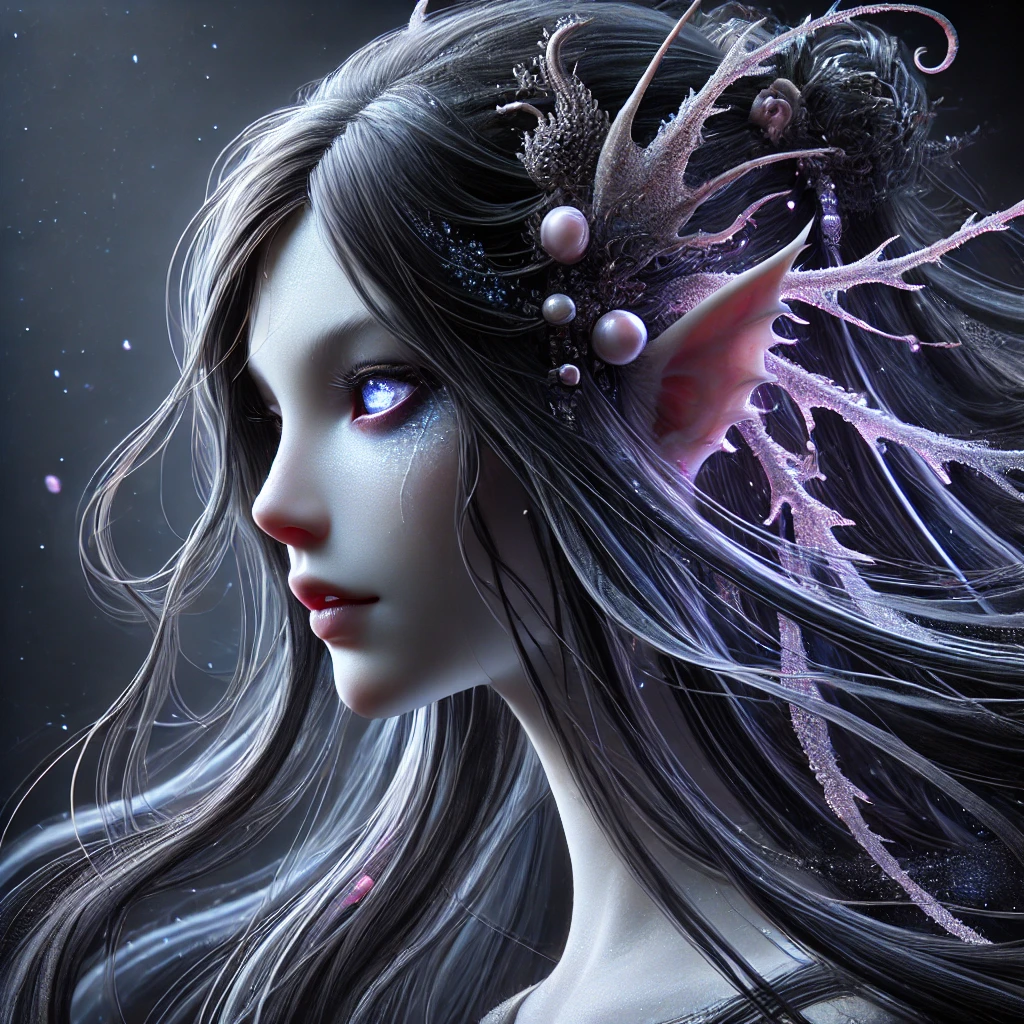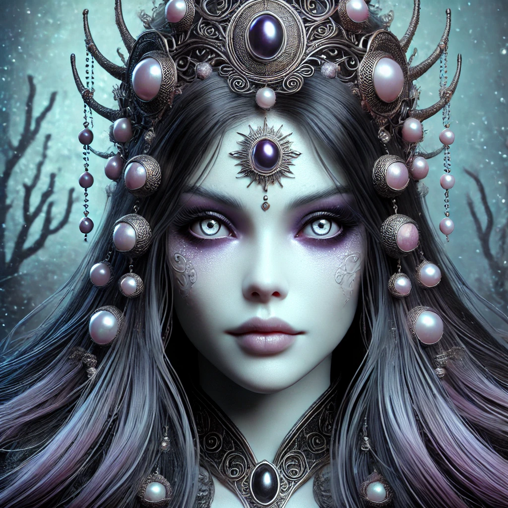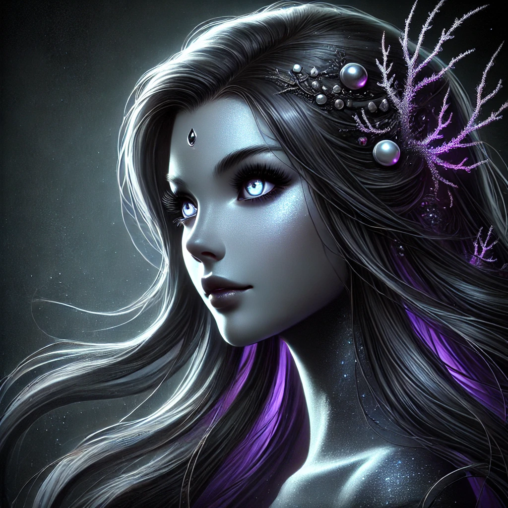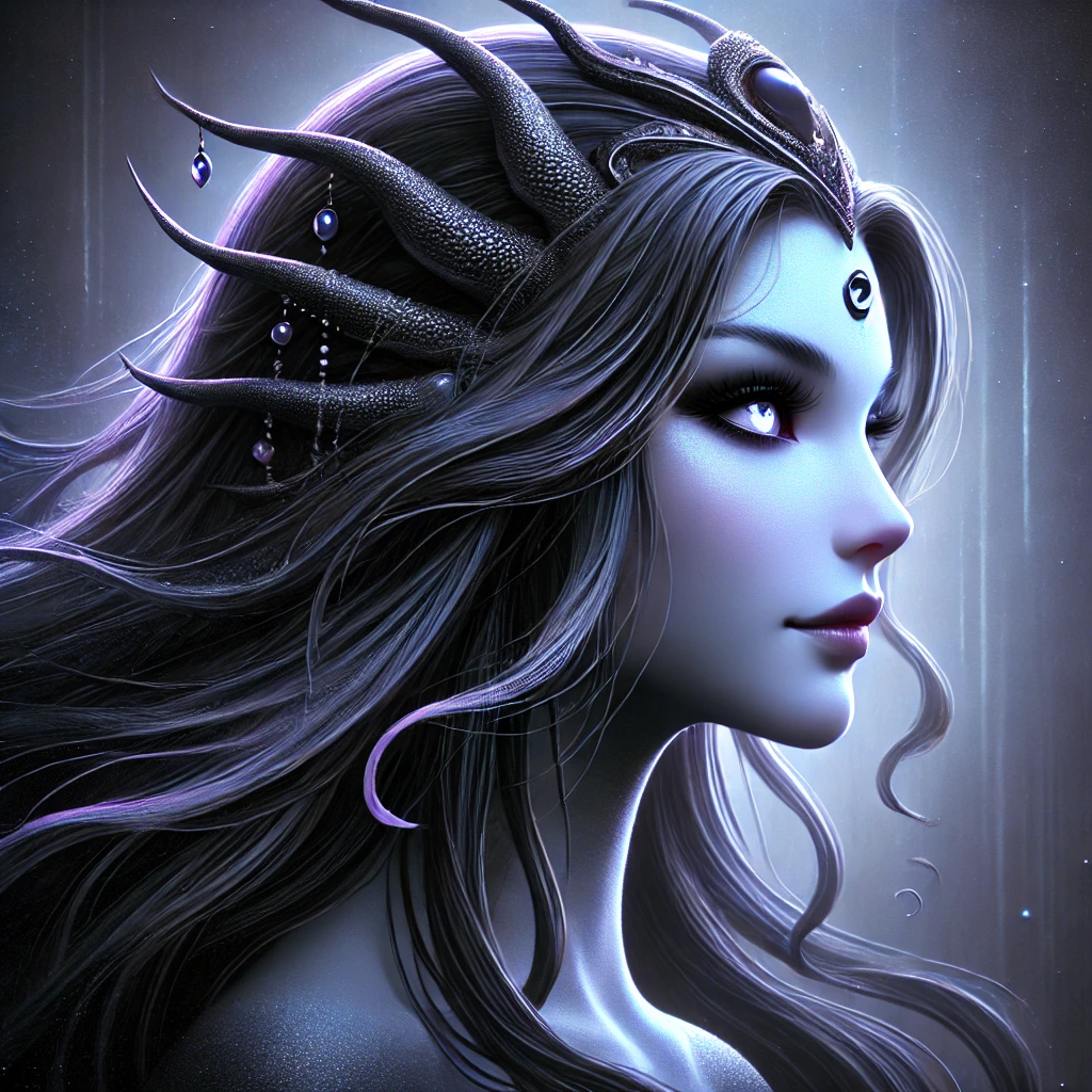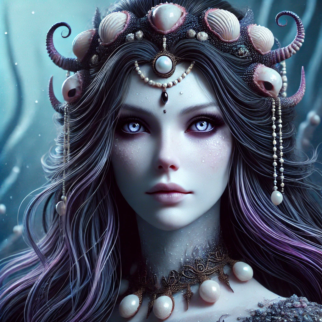 - Long black or abyssal purple hair flows like ink in water, adorned with trench pearls and fossil gems. It is often decorated with a crown of trench sigils or a mantle of fossilized coral.