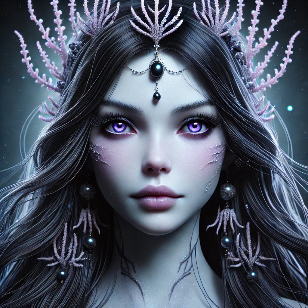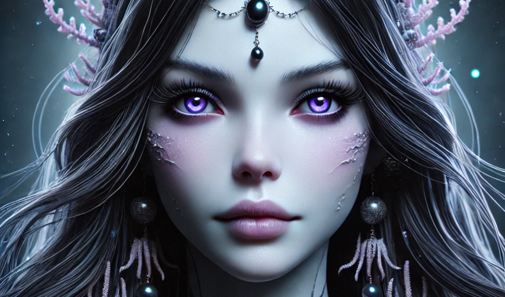 - Ethereal beauty with pale, moonlit skin and long black-violet hair drifting in trench currents.