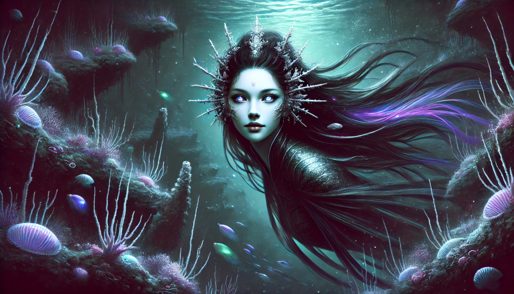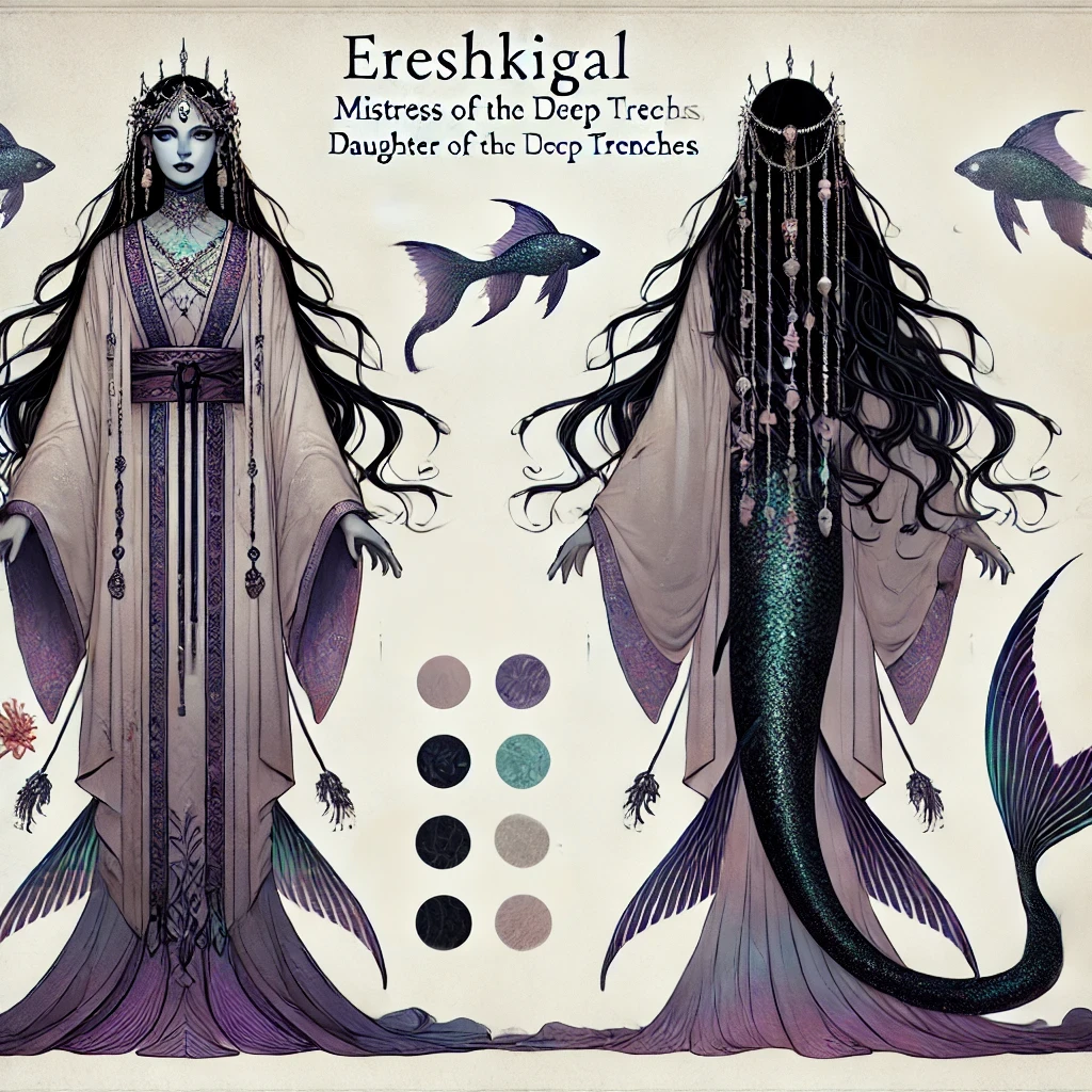 She rules the deepest trenches of the ocean, the shadow realms where no light penetrates and only memory remains. Here, she governs the Vaults of Echo — places where ancestral songs drift across eternity, encoded in the pressure and stone of the seabed. Ereshkigal does not merely reign in darkness — she listens to it, guards it, and knows its value.