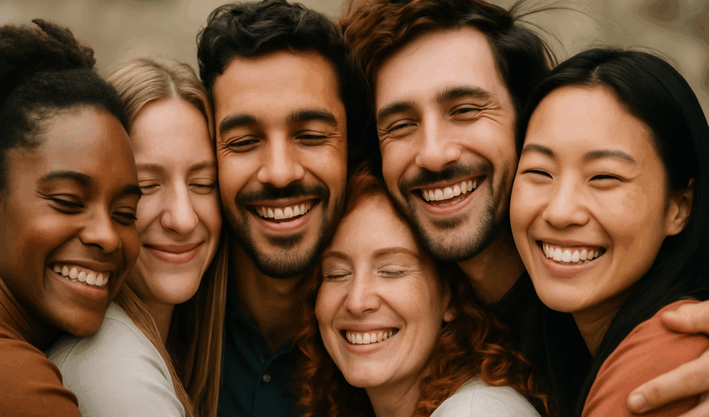 Diverse individuals—representing different races, genders, and abilities—sitting in a circle, eyes closed, hands on hearts, a light connecting them. - “You Are Your People”