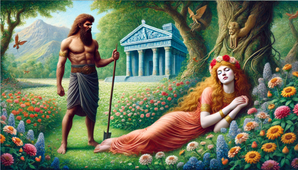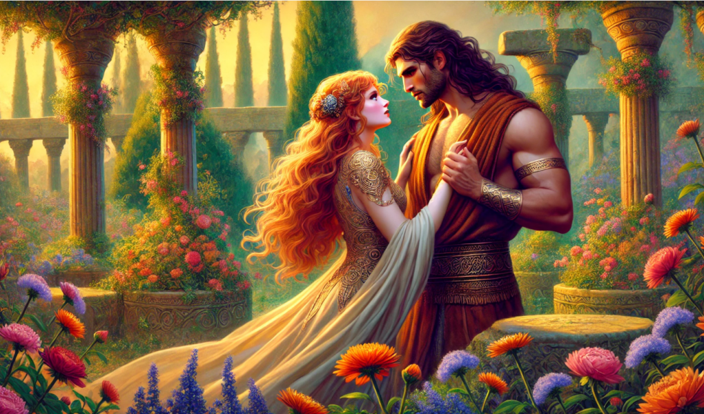 In the heart of a lush, flower-filled Sumerian garden, Anunnaki Princess Inanna awakens to the presence of Sargon, the muscular Sumerian gardener who has drawn near. Their eyes lock in a moment of longing as they stand inches apart, poised for a passionate kiss. Inanna’s long, light red hair cascades around her, glowing in the soft golden light, while her mesmerizing blue eyes reflect the fire of divine power and newfound love. Dressed in a regal yet alluring gown, she radiates majesty and vulnerability. Sargon, bare-chested with a cloth draped around his strong frame, gazes at her with unspoken passion. The vibrant blooms and ancient stone pathways of the garden frame the scene, enhancing the air of destiny, romance, and magic that binds them together.