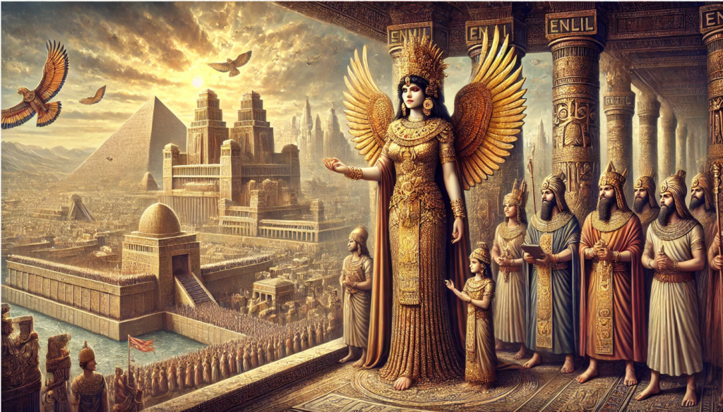 In this breathtaking depiction, Anunnaki Princess Inanna stands in regal authority, overseeing Sumer—the First Region, which she governs alongside the Enlil-ites, the lineage of Enlil. Dressed in a dazzling, gold-adorned gown with majestic wings symbolizing her divine power, she extends her hand in command over the thriving civilization below. The background showcases towering ziggurats, temples, and grand palaces of ancient Sumer (modern-day Iraq), bathed in golden light, representing the height of Anunnaki rule. The noble figures surrounding her, dressed in exquisite Sumerian royal attire, stand as her advisors and rulers, ensuring the stability of the land. Banners of Enlil flutter in the wind while the bustling city beneath teems with life, reinforcing the strength and grandeur of their rule. This image captures Inanna’s divine and earthly sovereignty as a ruler of the First Region.