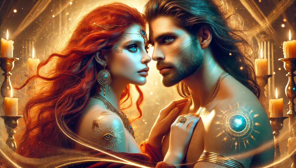 Locked in an intimate tantric embrace, Inanna and Sargon share a deep, soul-stirring connection, their eyes filled with passion and devotion. Inanna’s flowing red hair cascades around her, framing her mesmerizing blue eyes, which shine with divine love. Sargon, powerful and regal, gazes at her with adoration and intensity, his chiseled features softened by desire. Their golden adornments and celestial markings glimmer in the soft candlelight, reflecting their sacred bond and cosmic unity. The ethereal glow of the background, draped in flowing fabrics and warm ambient light, enhances the sensual yet divine atmosphere, capturing their timeless love, strength, and sacred destiny together.