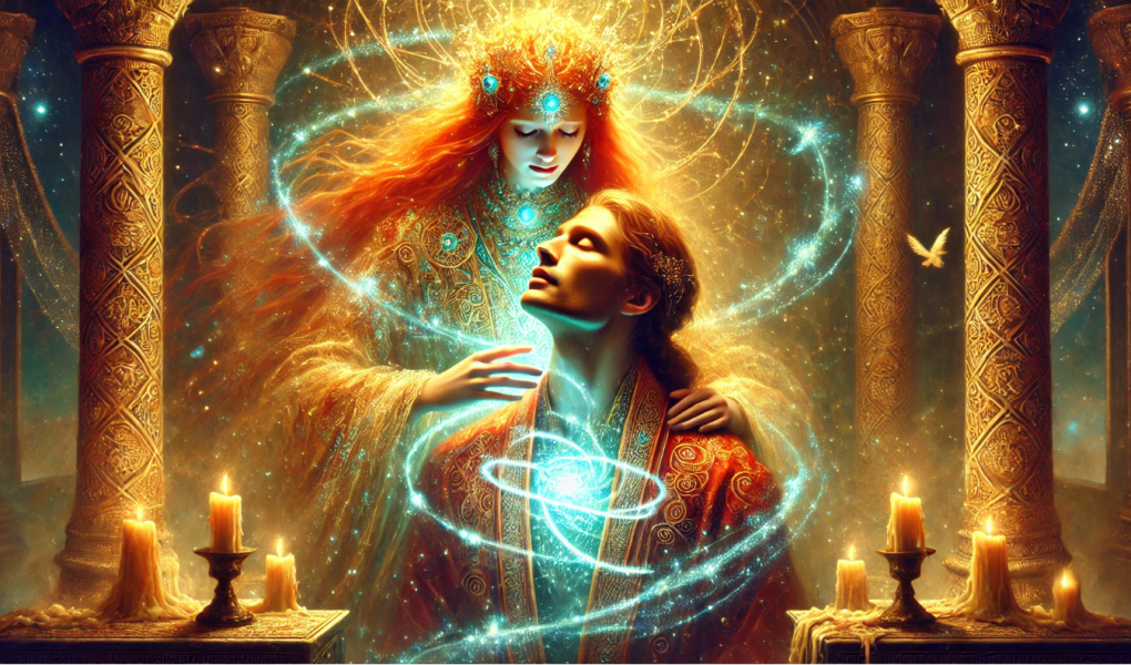 Inanna holds Banda in her softly lit chamber, bathed in a golden glow. Banda trembles in her arms, his dark hair falling gently as an intense wave of energy surges through him, spiraling upward into his crown. His eyes reflect awe and wonder as his vision blurs and sharpens, revealing the universe unfolding before him, each star connected by threads of light. Inanna, a radiant goddess with long red hair and glowing blue eyes, cradles him with love and calm strength. Her ethereal robe adorned with intricate gold and turquoise patterns enhances her divine presence. Candles flicker softly around them, ancient symbols decorating the walls, as she whispers ancient words of power and love, guiding him into a deep, dreamless sleep.