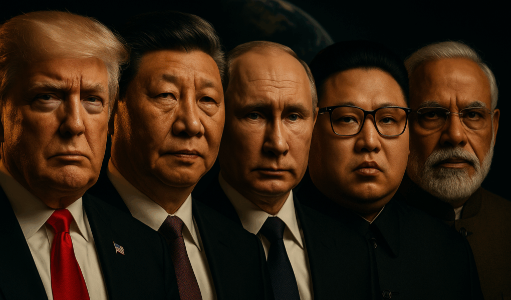 Five world leaders—Donald Trump, Xi Jinping, Vladimir Putin, Kim Jong Un, and Narendra Modi—stand in stark chiaroscuro, their faces lit by alternating bands of gold and shadow. Each expression reflects a different facet of authority: Trump’s defiant smirk, Xi’s calm control, Putin’s icy calculation, Kim’s divine self-certainty, and Modi’s inward conviction. Behind them, the faint curvature of Earth glows like a stage spotlight—humanity’s fate suspended between their rival visions.