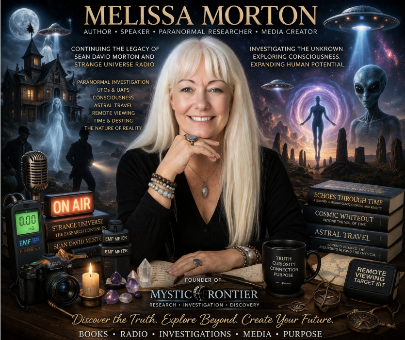 Melissa Morton is an author, speaker, paranormal researcher, and media creator continuing the legacy of researcher and radio host Sean David Morton and the Strange Universe program. Her work explores paranormal investigation, UFO and UAP research, consciousness, astral travel, and remote viewing. Through her project Mystic Frontier and her upcoming books and training materials, Melissa brings a thoughtful, investigative approach to understanding the nature of reality and human potential.