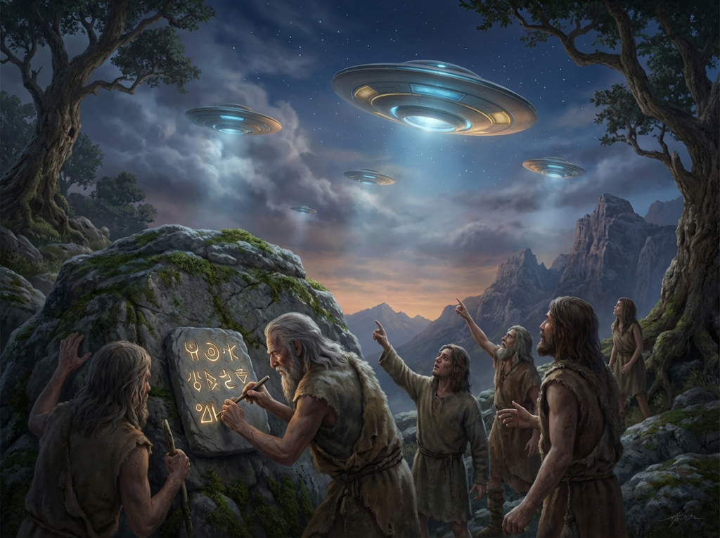 Ancient humans record celestial phenomena as symbols while advanced craft descend from the sky. The image visually bridges mythic storytelling and technological observation, showing that “myth” was an early data language.