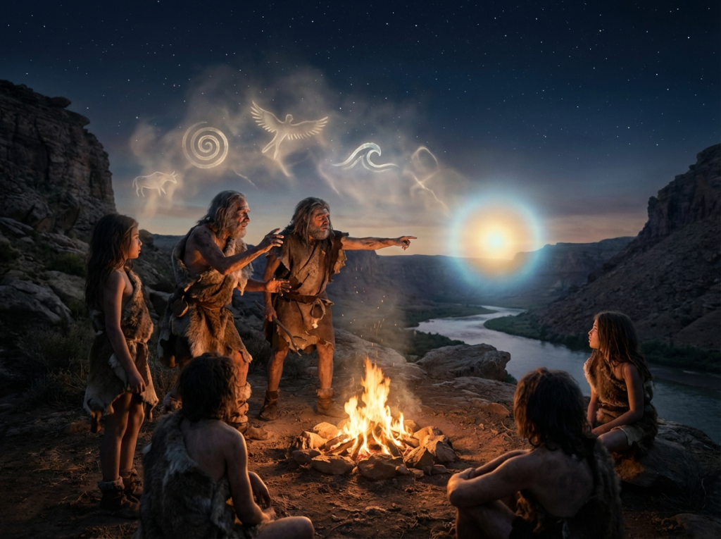 A visual metaphor for early humans translating advanced phenomena into story and symbol—capturing sound, light, and movement without technical vocabulary.
