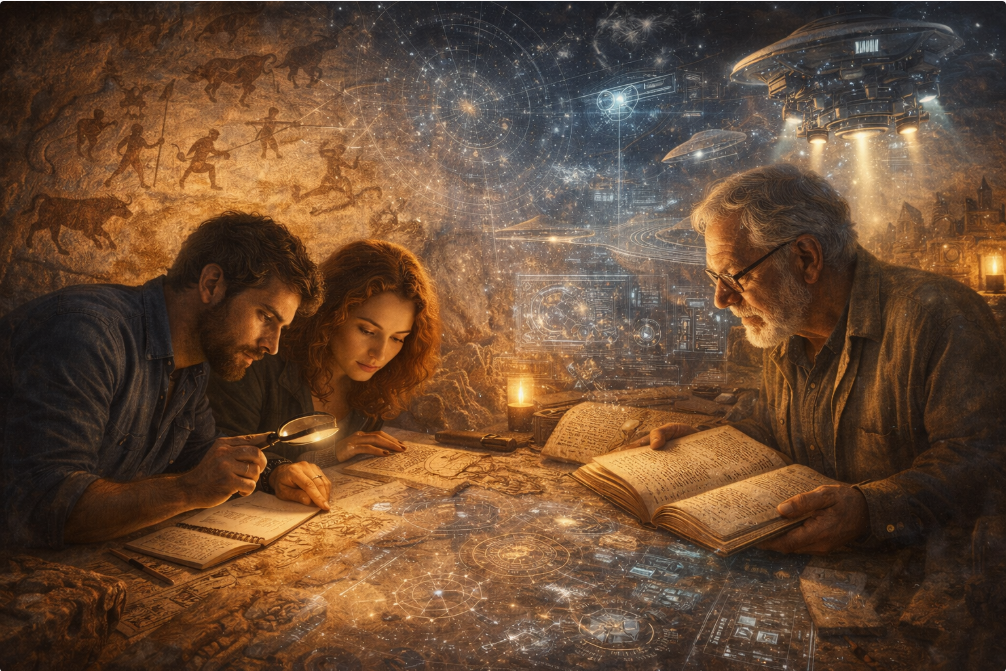From that foundation, I integrated classical anthropology with ancient astronaut studies, mythic texts, archaeology, UFOlogy, Sumerology, and cross-cultural theology. Rather than treating these fields as separate, I approached them as overlapping lenses describing the same phenomena.