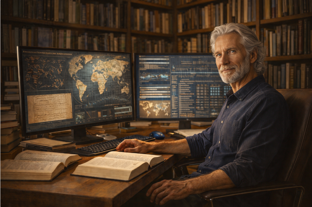 An elder ethnologist synthesizing ancient records and real-time global data—connecting patterns across cultures, epochs, and disciplines without turning history into belief.