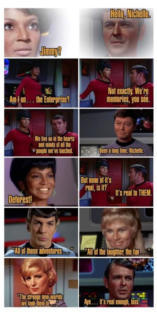 I thought it was a Trekkie, and so I said, ‘Sure.’ I looked across the room and whoever the fan was had to wait because there was Dr. Martin Luther King walking towards me with this big grin on his face. He reached out to me and said, ‘Yes, Ms. Nichols, I am your greatest fan.’ He said that Star Trek was the only show that he, and his wife Coretta, would allow their three little children to stay up and watch. [She told King about her plans to leave the series because she wanted to take a role that was tied to Broadway.] I never got to tell him why, because he said, ‘you cannot, you cannot…for the first time on television, we will be seen as we should be seen every day, as intelligent, quality, beautiful, people who can sing dance, and can go to space, who are professors, lawyers.” Dr. King Jr went further stating “If you leave, that door can be closed because your role is not a black role, and is not a female role, he can fill it with anybody even an alien.”