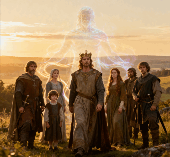 Below them, storm clouds swirl over Norman castles and Saxon villages — symbols of oppression and awakening intertwined. Yet through the mist, beams of divine light reach the earth like guiding threads. In those rays, farmers till, monks write, and healers whisper prayers, preserving the current of partnership consciousness across generations.