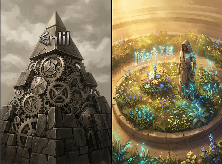 Left side: A grayscale, mechanical pyramid made of cogs and cold stone, with a sharp “Enlil” sigil at the top. Right side: A vibrant, golden-lit circular garden with the Enki-Avatar standing among wildflowers, a gentle “Me” code glowing in the air.