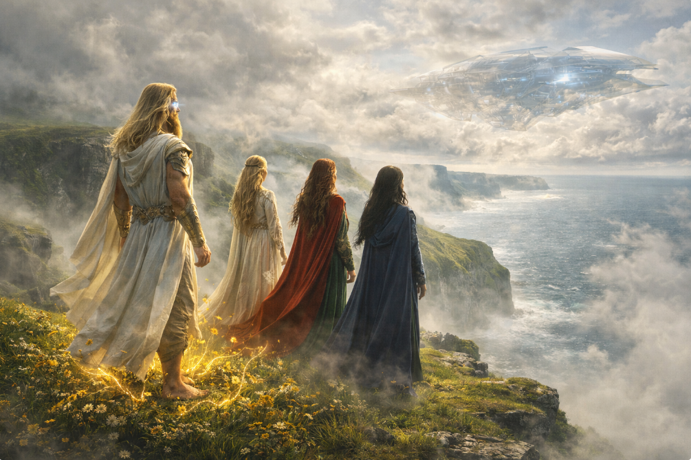 When the friction of the Middle East became a threat to the mission’s integrity, the team “got out of Dodge.” They faked the departure and moved North to the British Isles. Landing in Ireland and the future UK, they became the basis for the Tuatha Dé Danann—the legendary tribe of golden-haired, blue-eyed gods. This was a strategic move to find “friendlier ground” away from the darkening influence of Marduk in the Americas and the Enlil-Matrix in the Levant.