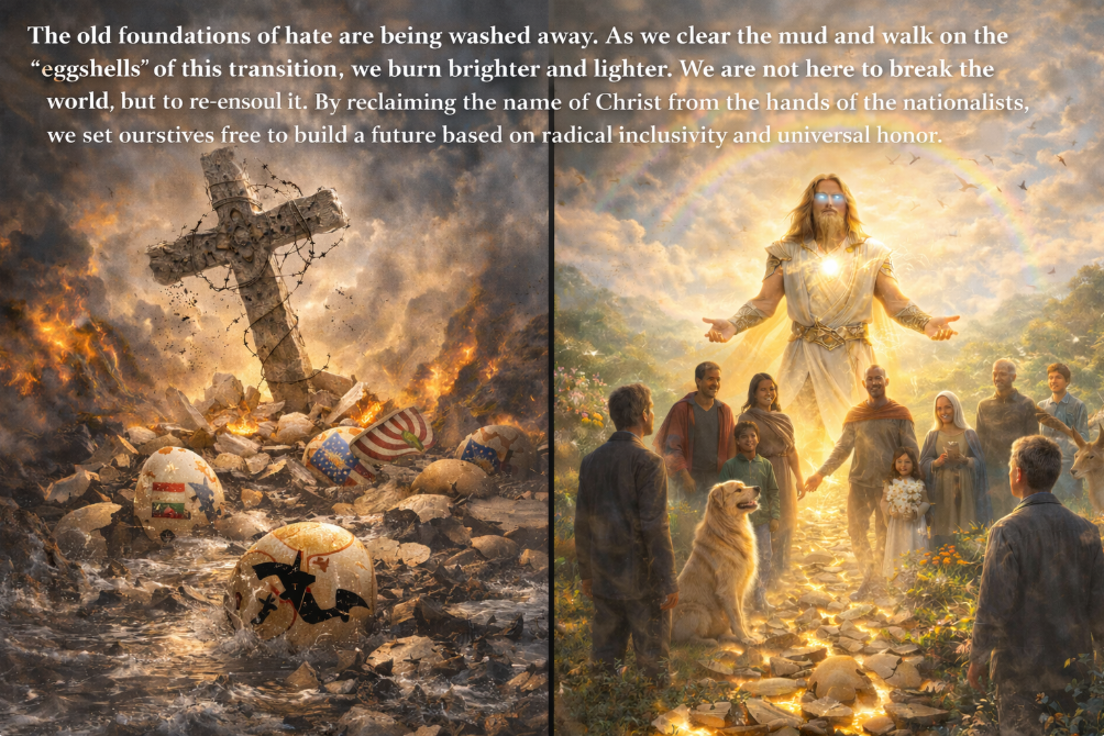 The old foundations of hate are being washed away. As we clear the mud and walk on the “eggshells” of this transition, we burn brighter and lighter. We are not here to break the world, but to re-ensoul it. By reclaiming the name of Christ from the hands of the nationalists, we set ourselves free to build a future based on radical inclusivity and universal honor.