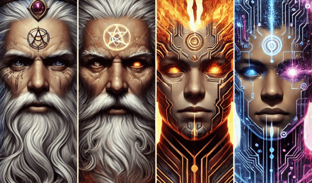 A dual-faced archetype stands poised between epochs. On one side, the golden-lit visage of an ancient high priest, crowned, serene, eyes full of memory. On the other hand, a cybernetic warrior—cold, calculating, embedded with circuits and vision tools. The background splits like time itself: one half steeped in sacred antiquity, the other pulsing with technological ambition. This is the face of a civilization at the brink—a being of both judgment and possibility, bearing the choice written in history’s mirror.