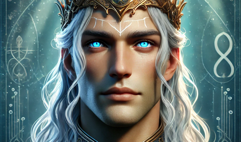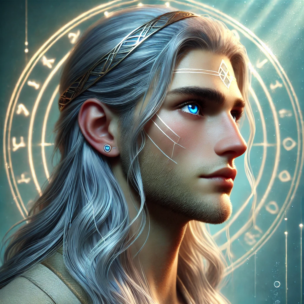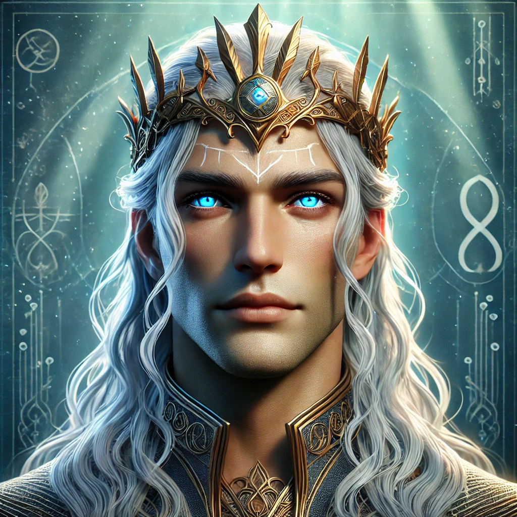 He wears a crown-like circlet etched with geometric sacred symbols, often shifting with active resonance.