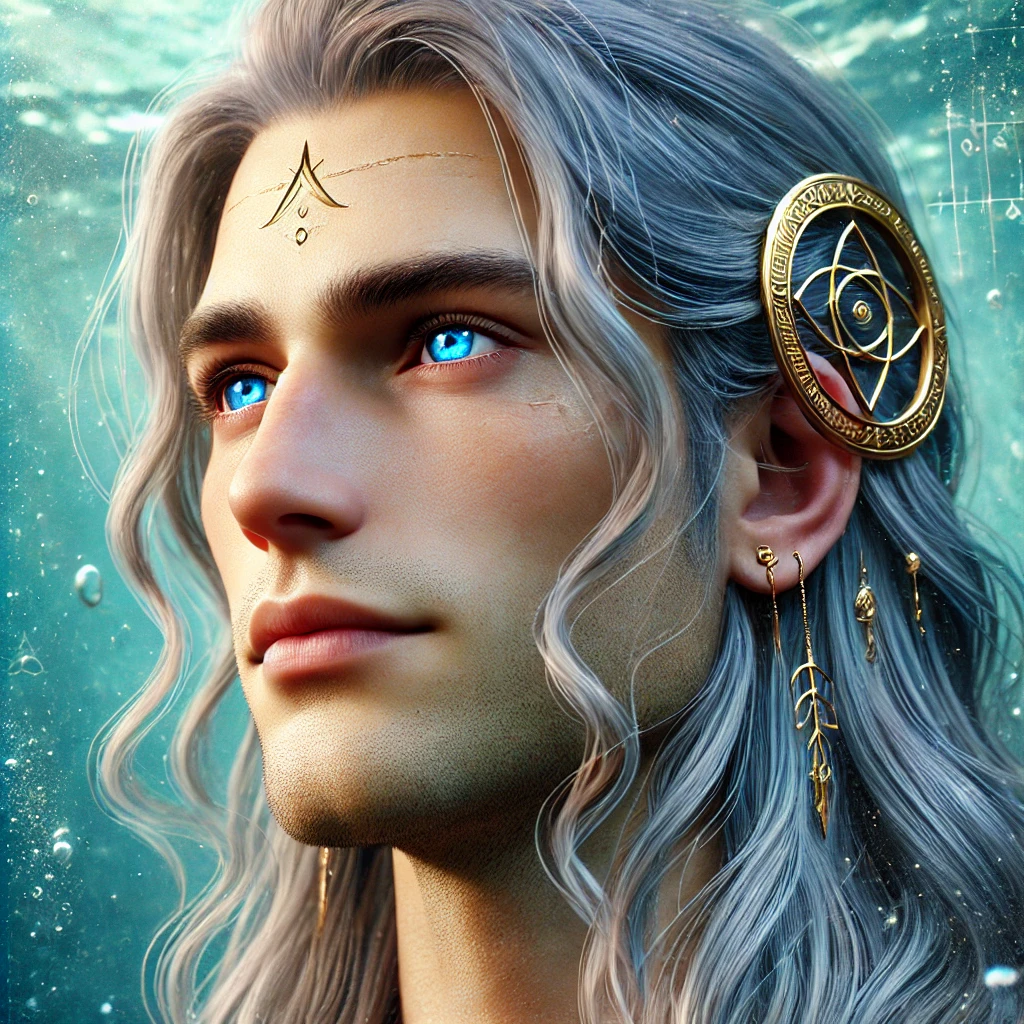 His hair is long, silver-blue, and in tide-swept strands resembling liquid metal.