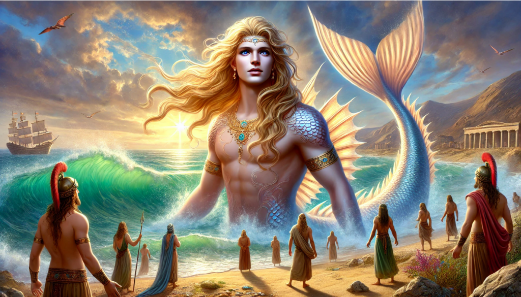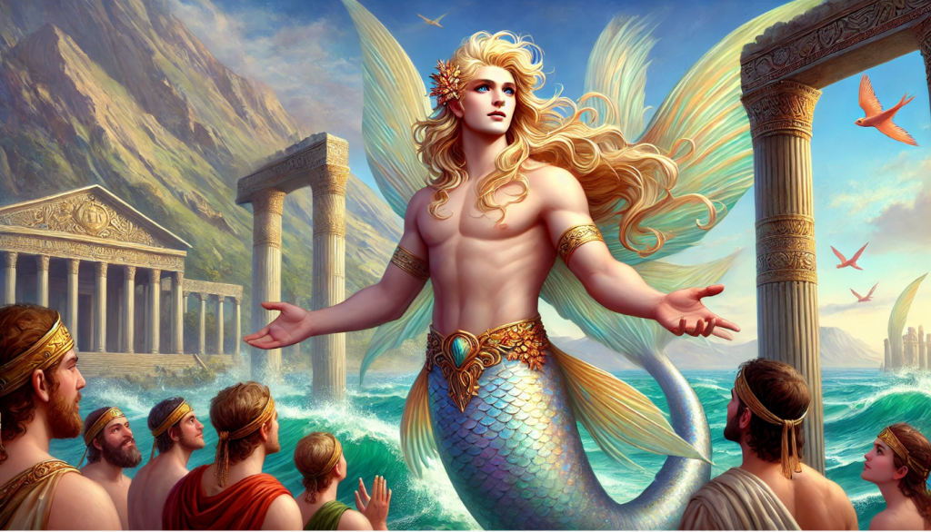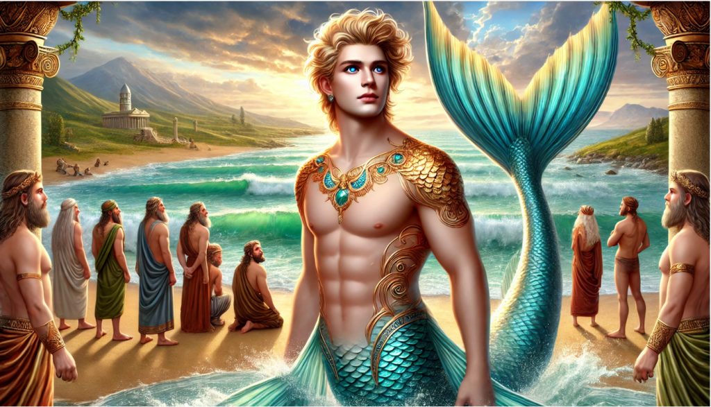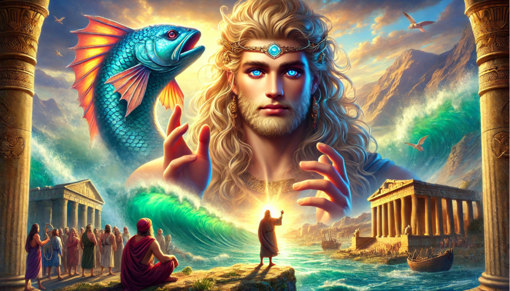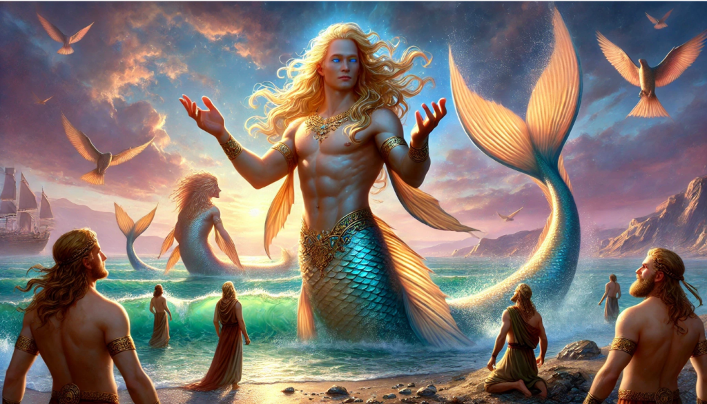 In this depiction, Oannes is shown as a wise and serene figure, standing at the shoreline where land and water meet. His form blends human and aquatic elements, emphasizing his unique connection to both worlds. The background includes a scene of early humans gathered around him, listening intently to his teachings, symbolizing his pivotal role in shaping human destiny.