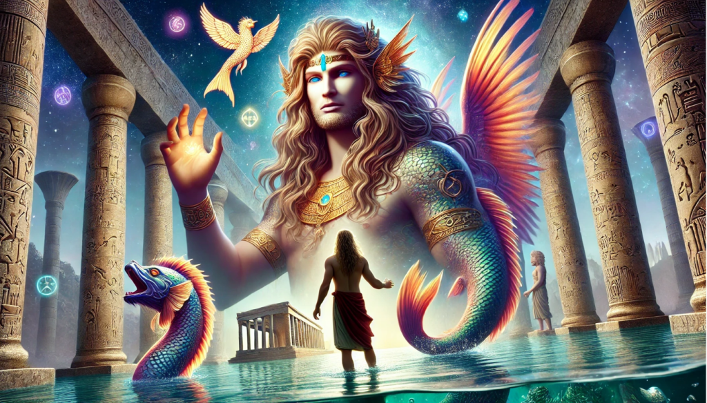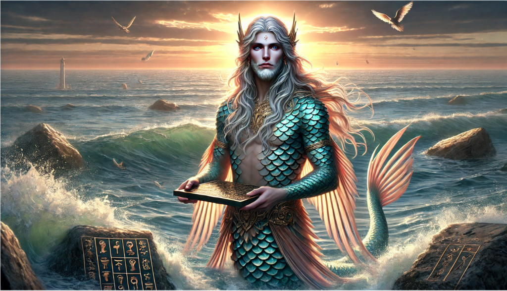 Oannes, an emanation of Enki, is depicted as a wise and benevolent figure emerging from the seas to teach early humans essential knowledge, including writing, agriculture, and governance.