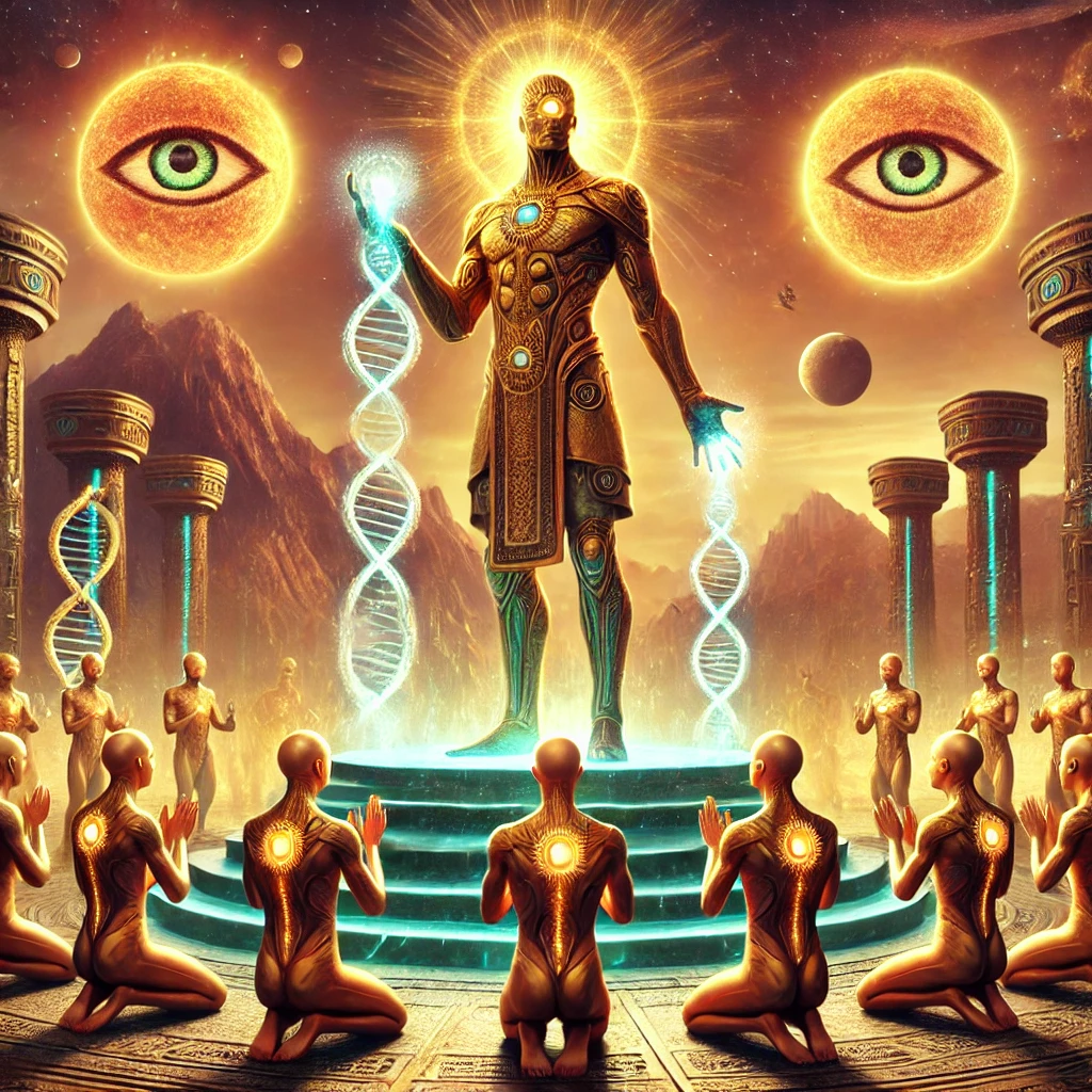 Towering Anunnaki beings loom above a dystopian Earth, bathed in the reddish glow of a foreign sky. Below, symbols of human power structures—monolithic government towers, massive corporate machinery, and glowing temples of organized religion—rise like fortresses of control. Energy beams connect the Anunnaki to elite human figures manipulating the masses like puppets. This image represents the seeding of “dominator consciousness” by extraterrestrial creators, embedding control systems under the guise of order and progress.