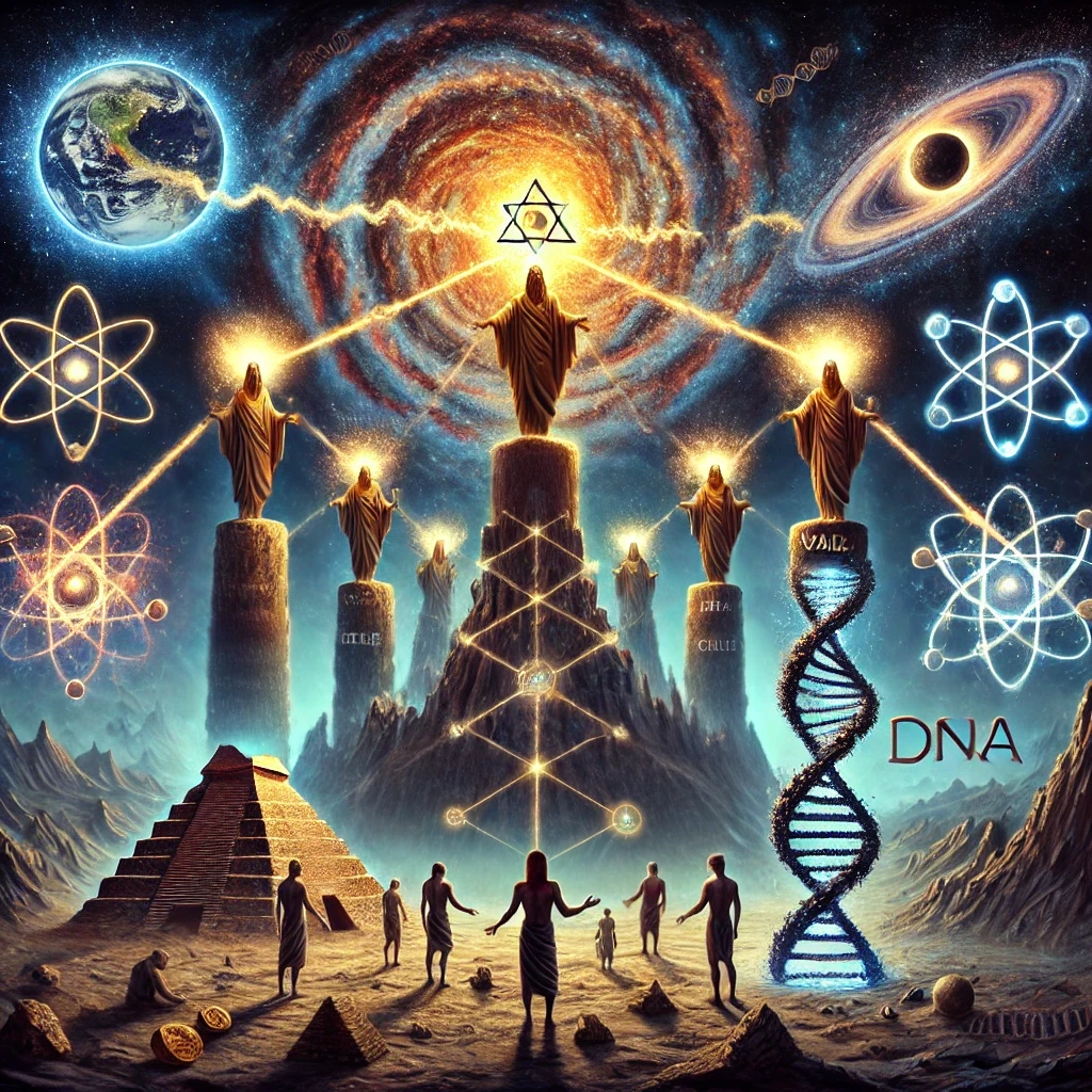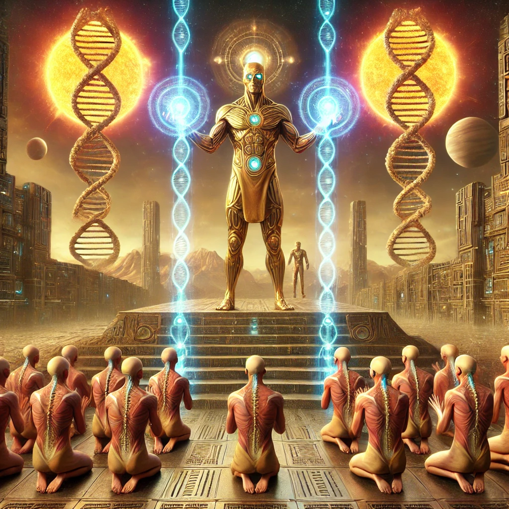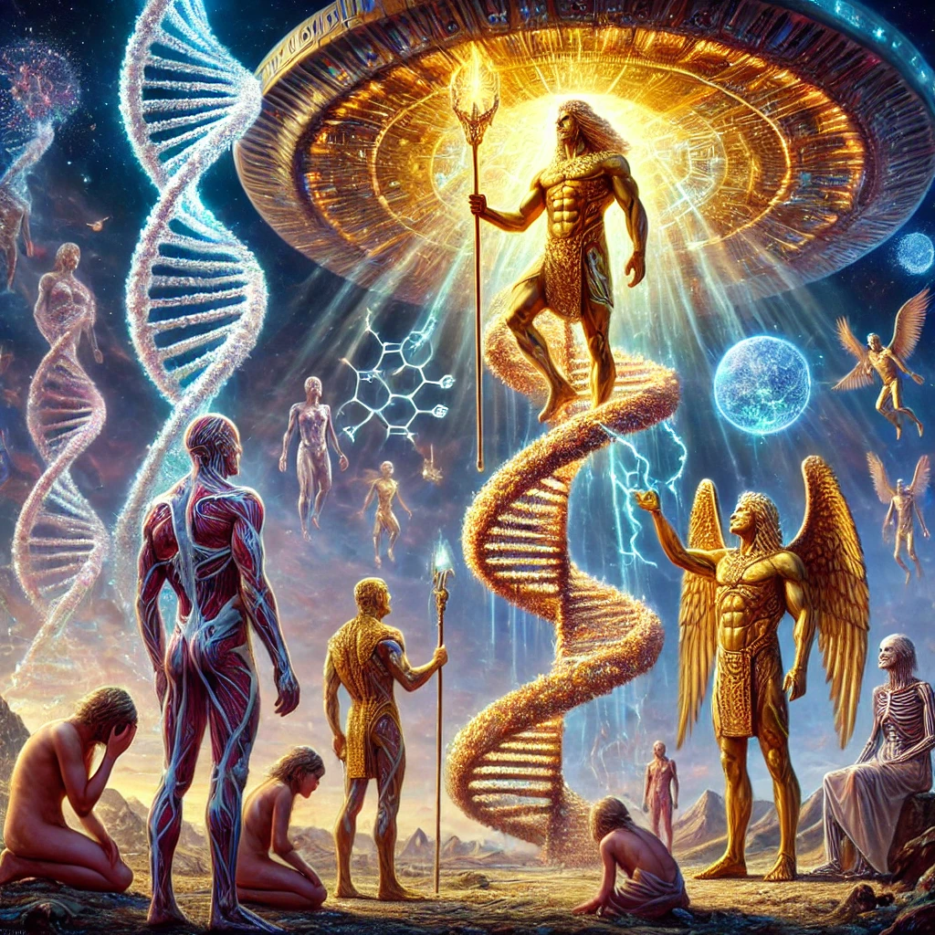 Commanding Anunnaki descended radiantly, imposing a hierarchical and dualistic blueprint upon early humans. Yahweh-Enlil stands elevated, a glowing staff transmitting ideology into human minds. Angelic emissaries hover with solemn authority, while darker figures—rebellious Igigi and Prince Marduk—enforce the new order through raw power. DNA strands fracture in the air, symbolizing the rupture of natural empathy. Below, humanity fractures as well—some bow, others rebel, all confused under a sky torn between light and shadow. This is a haunting portrayal of engineered division.