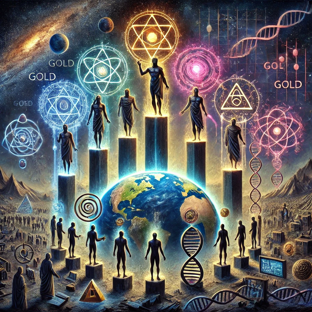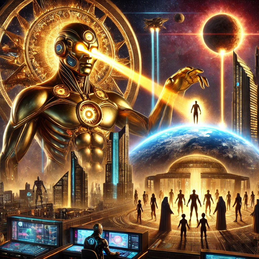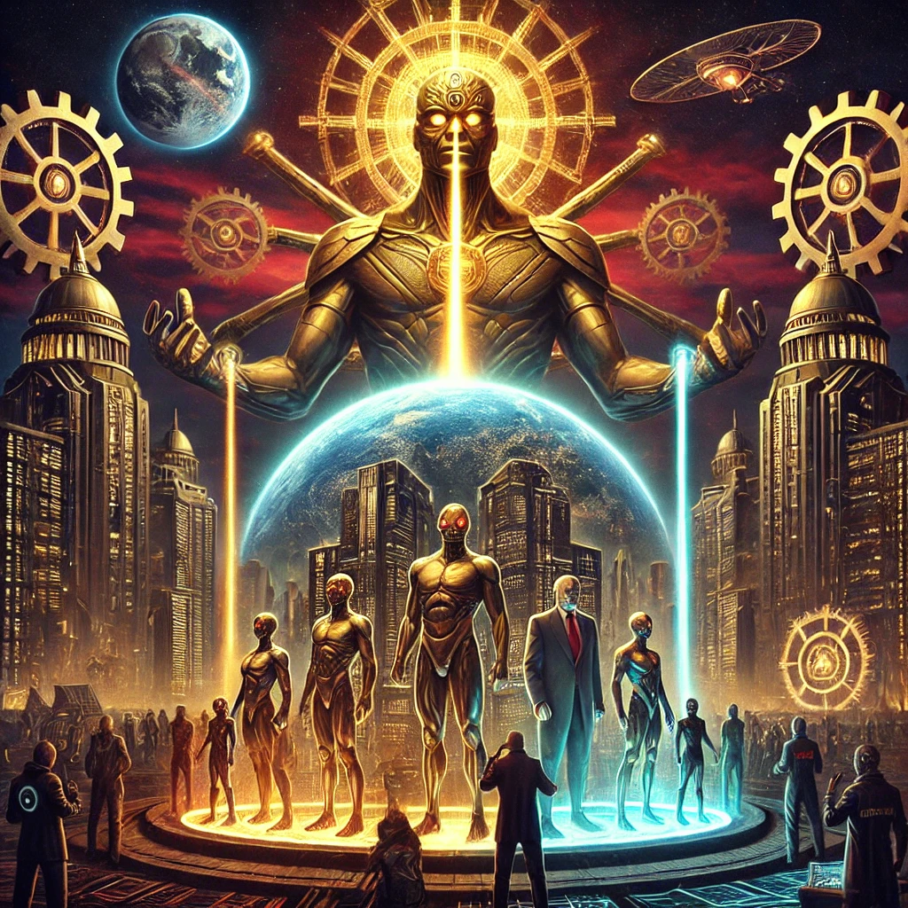Set against a burning sky with Nibiru ominously visible on the horizon, this artwork depicts the Anunnaki’s enduring influence on humanity. Clad in golden armor and glowing with ancient power, they oversee a planet divided by class, ideology, and illusion. The landscape below is a tapestry of manipulated systems—corporate greed, political hierarchy, and spiritual deception—all fed by energy beams from their extraterrestrial architects. This scene visualizes a haunting truth: humanity’s deepest institutions may be echoes of alien design.