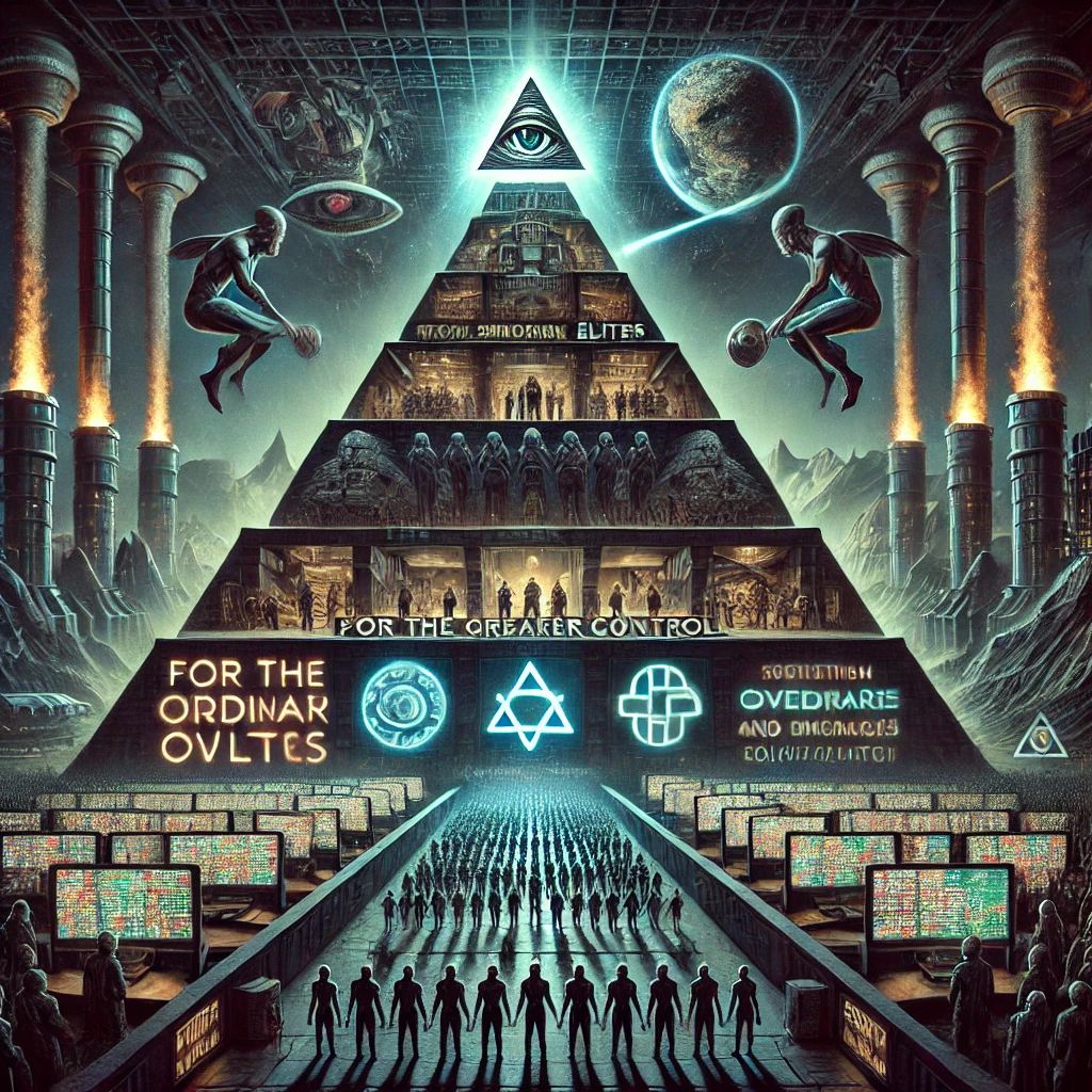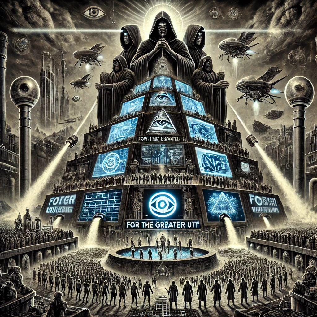 A dark symbolic pyramid rises through a polluted dystopia, crowned by alien overlords and human elites. Government, corporate, and religious institutions form the mid-layers, feeding false promises through glowing propaganda screens. Below, the people are worn and watched, their resources extracted through hidden channels that rise to power. The slogan “For the Greater Good” masks the exploitation engineered from the top.