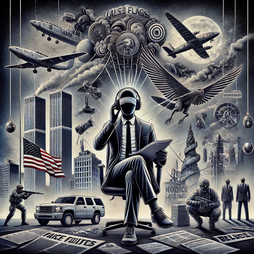 A journalist sits blindfolded and disconnected, surrounded by piles of ignored evidence. Behind them, a smoky collage of manipulated events—including stylized towers, battlefield flashes, and masked agents—suggests orchestrated chaos. Strings connect shadowy figures to symbols of media and power, evoking hidden control behind tragedies and cover-ups.