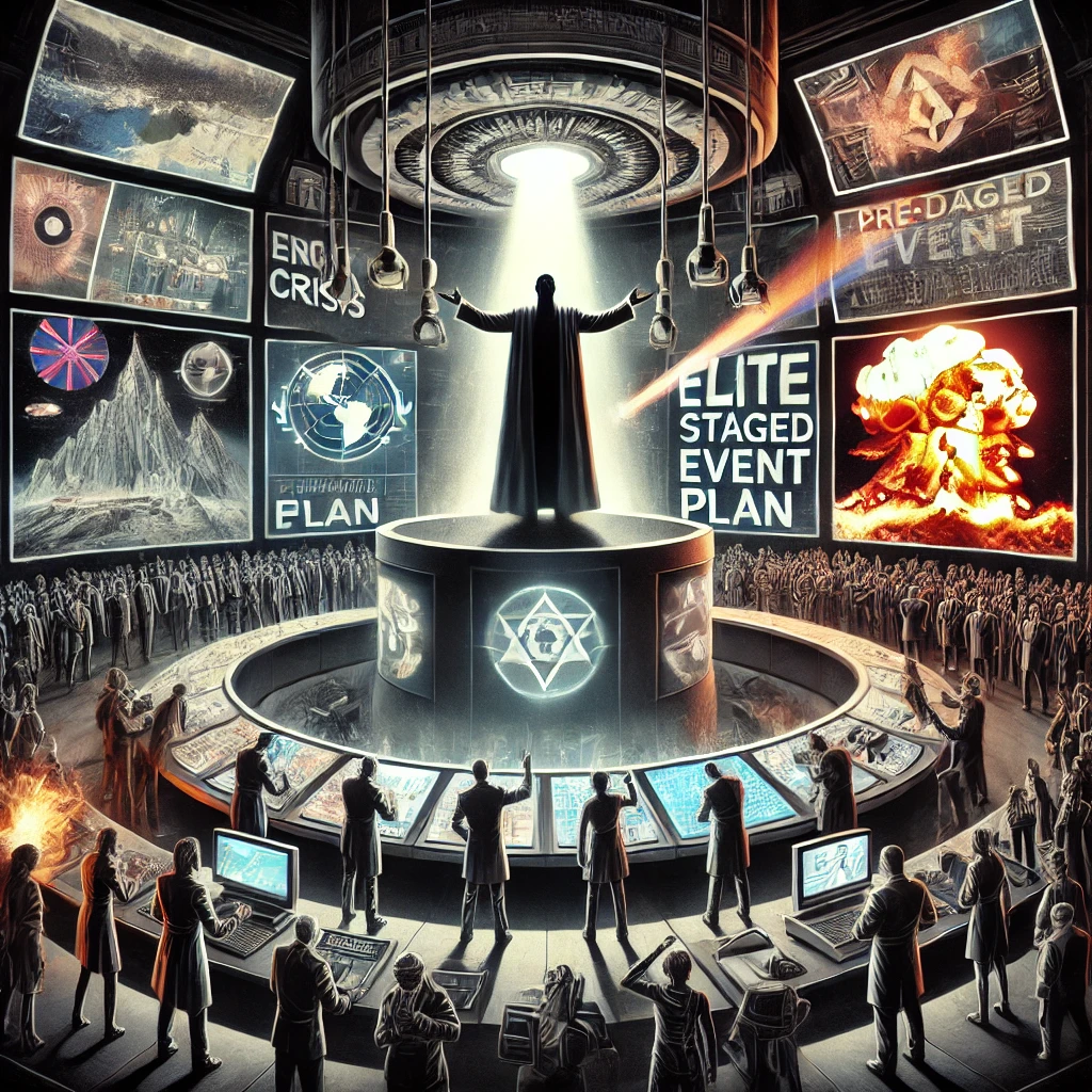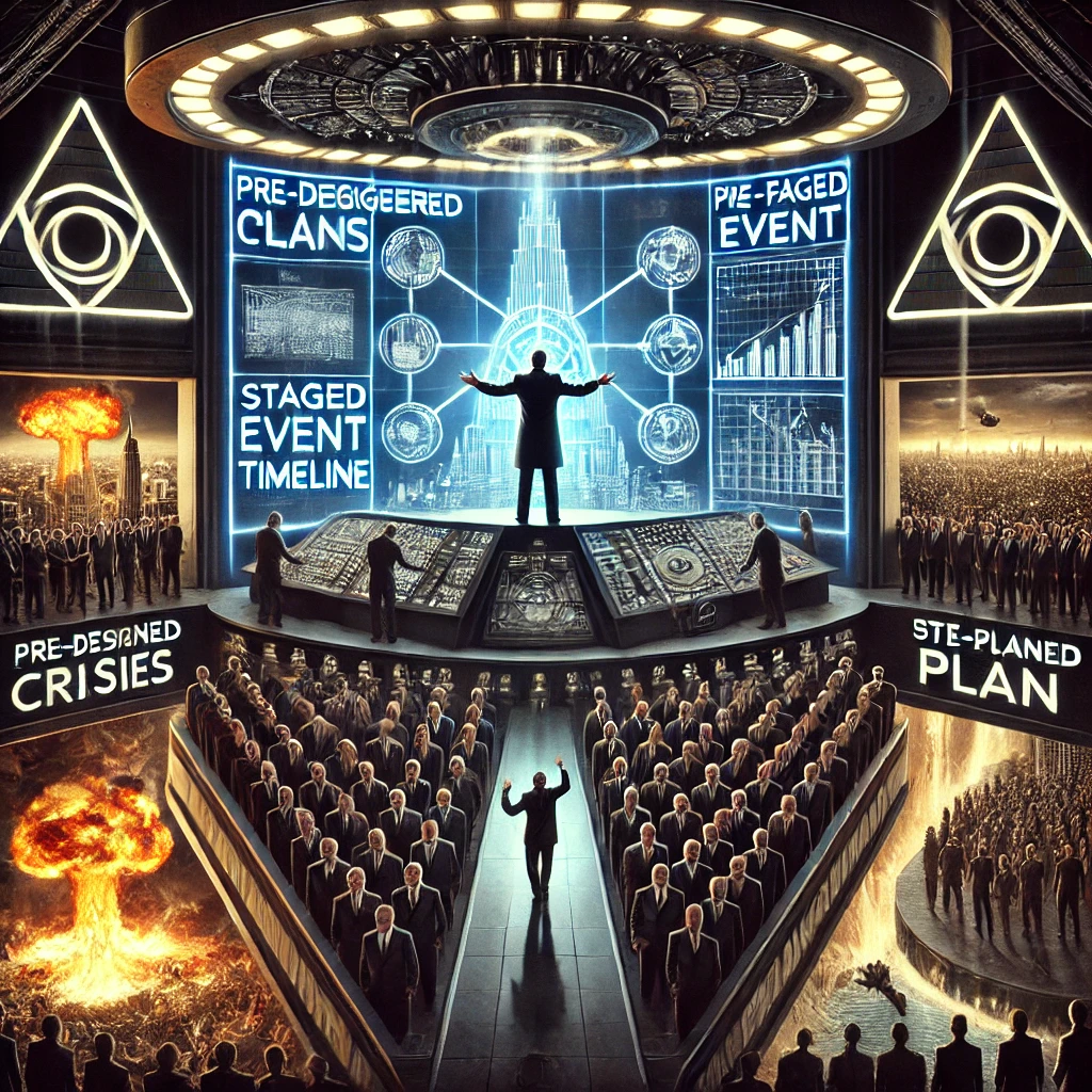 This dystopian vision shows a deliberate chain of events: a fiery city collapse, panicked citizens, and the rise of cold, authoritarian structures. The masterminds watch calmly from above, orchestrating the transition from destruction to domination. Surveillance beams carve through smoke, propaganda screens declare loyalty to safety, while true intentions lie buried in secret documents.