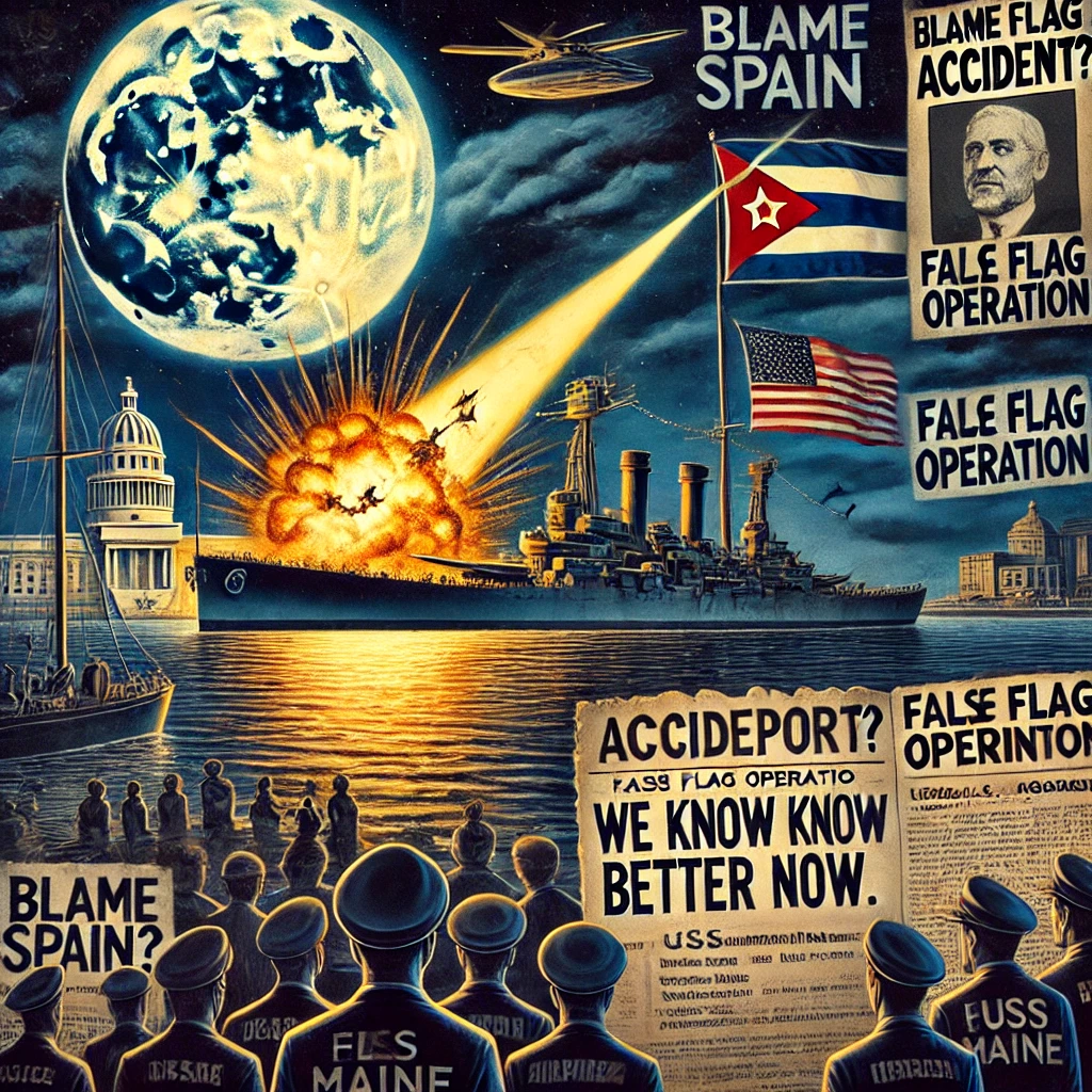 The explosion of the USS Maine dominates the harbor, captured beneath a brooding night sky. In the shadows, mysterious figures suggest covert involvement. Scattered headlines accuse Spain, while veiled documents labeled “False Flag Operation” hint at a hidden agenda. At a podium, a U.S. official reassures the public—while in the corner, a corrected report overlays the official story with the truth: “We Know Better Now.” The piece blends historical drama with a modern lens of reevaluation.