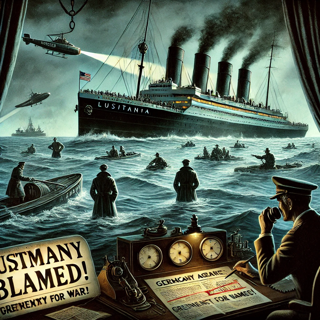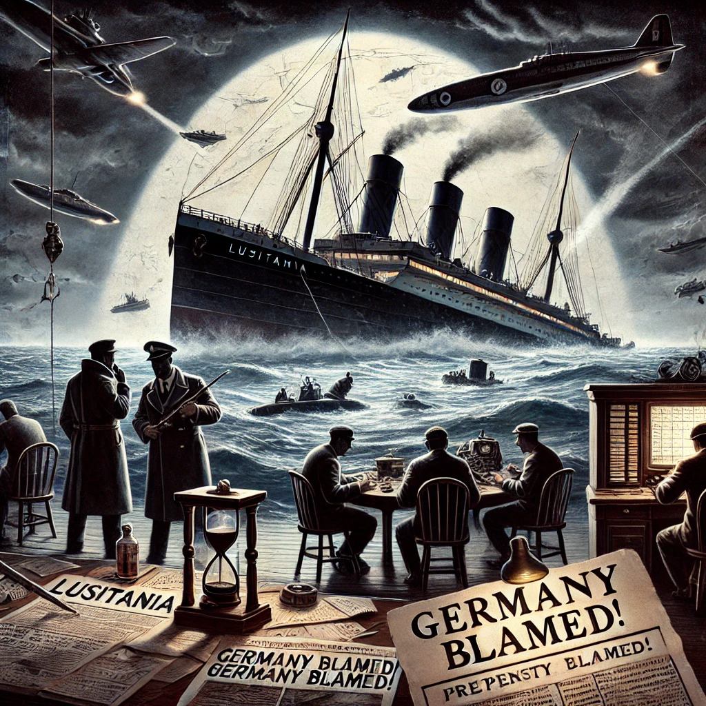 The Lusitania breaks apart under torpedo fire in a dark, turbulent sea. In the distance, shadowy agents plot in a war room, their fingers on a map marked “Lusitania Route.” A telegraph clatters beside them, sending out coded coordinates. German U-boats close in, guided toward the ship. Floating headlines scream “Germany Blamed!” but damp documents stamped “Pretext for War” whisper a deeper intent behind them.