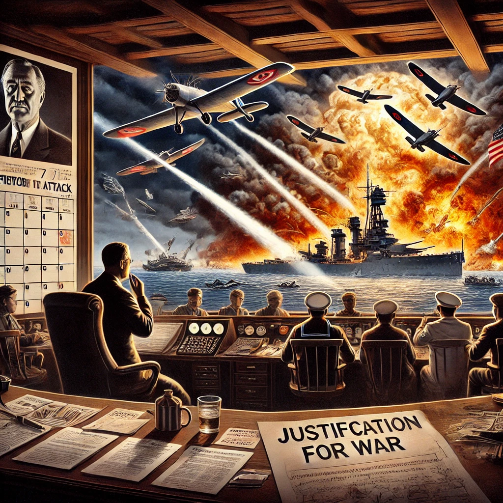 As flames consume the U.S. fleet at Pearl Harbor, Japanese bombers fill the sky. In the background, a shadowy war room reveals President Roosevelt watching the attack unfold through a large display, hand resting on a document marked “Justification for War.” Naval officers protest, their pleas for defensive action unheard. A calendar pinned to the wall shows December 7, 1941, while covert attack routes are traced across maps behind him. This image evokes a dramatic convergence of tragedy, manipulation, and global strategy.