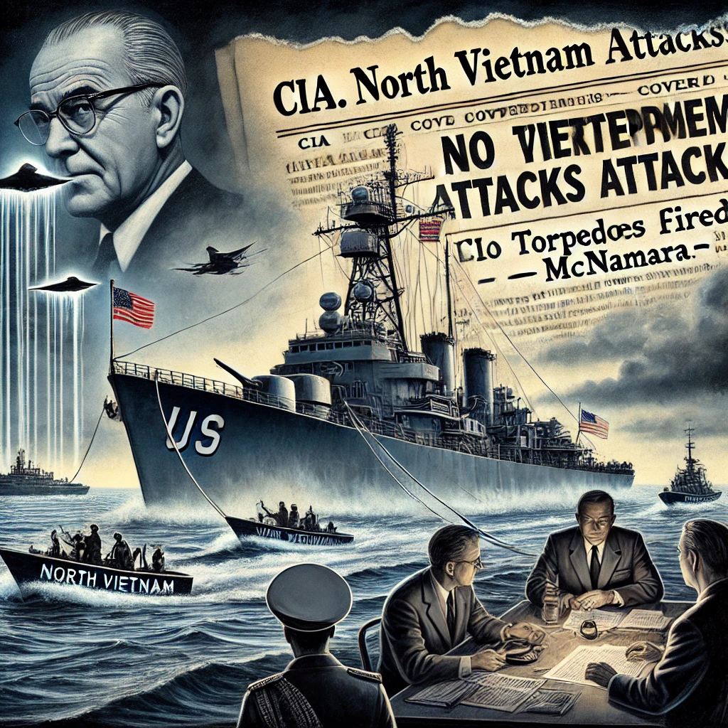 The USS Maddox sails through shadowy waters beneath a turbulent sky, while misty, ghost-like images of North Vietnamese boats hover above, symbolizing threats that never truly emerged. In the background, President Lyndon B. Johnson addresses the nation confidently, as CIA agents work behind the scenes with maps labeled “Covert Attacks.” A torn newspaper proclaims “North Vietnam Attacks!” beside a declassified document stamped “No Torpedoes Fired – McNamara.” The entire scene captures the tension between illusion and reality, and the machinery of manufactured conflict.