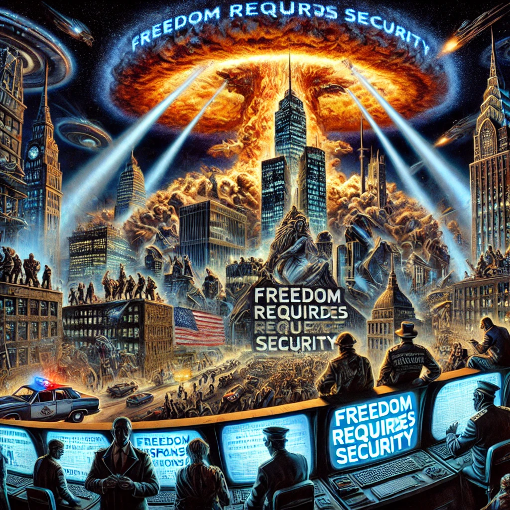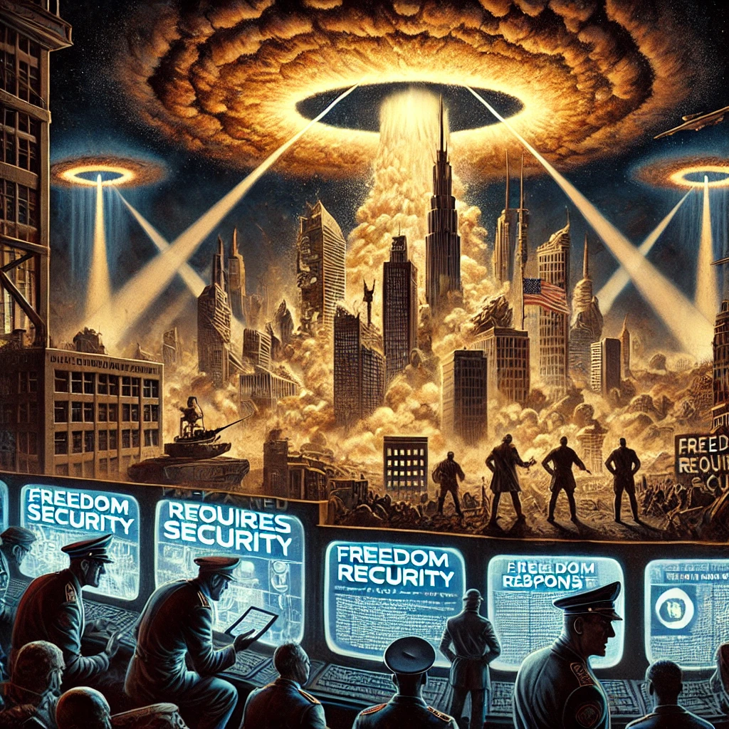 Amid the smoldering remains of a shattered city, towering surveillance structures emerge, casting beams of data-gathering light across stunned civilians. Behind thick glass, shadowy officials observe without emotion, while plans labeled “War Strategy” and “Pre-Planned Response” rest at their fingertips. A billboard glows with the haunting phrase: “Freedom Requires Security.” The image speaks to control masked as protection.