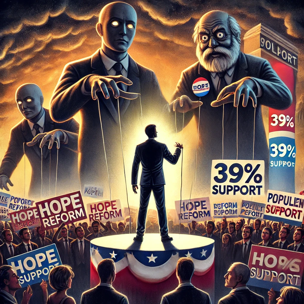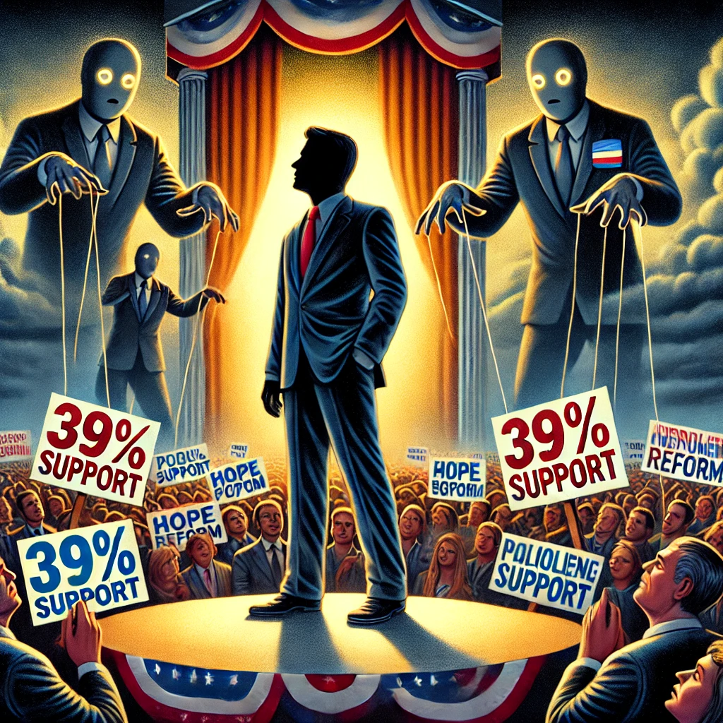 A lone candidate shines onstage before a hopeful crowd, “39% Support” glowing above. In the background, ominous faceless figures in suits lurk behind curtains, manipulating strings. A distant family watches anxiously as dark clouds gather overhead. The piece captures the tension between public enthusiasm and hidden pressure from entrenched powers.