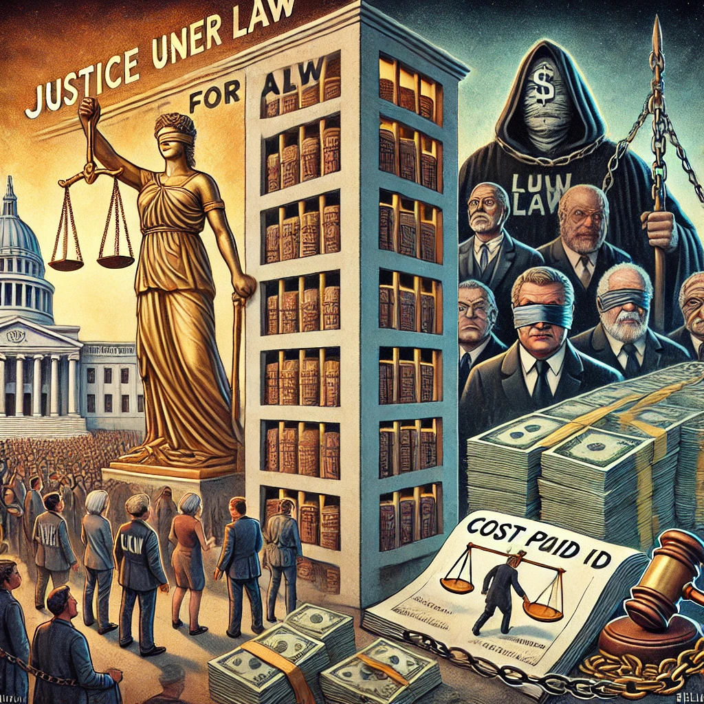 The image splits a staged ideal from a hidden reality. On the surface, pristine courthouses and confident judges hold books promising “Justice for All.” But just behind this glowing veneer, faceless elites manipulate the very same laws as instruments of control. Below, most citizens are shackled, crushed by enormous legal tomes and financial burdens, as ledgers etched “Cost Paid by the Majority” reveal the real beneficiaries. A billboard above reinforces the illusion: “Equality Under Law.” The piece delivers a visual critique of how power and law can coalesce into systemic injustice.