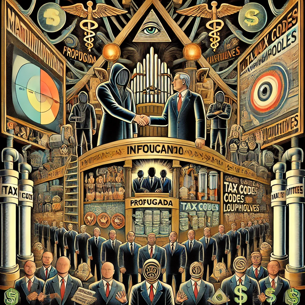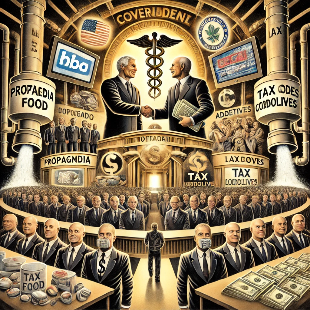 Golden light bathes a secretive handshake between corporate tycoons and shadowy government officials. Money-filled briefcases trade hands beneath pillars of influence: propaganda screens, law books with loopholes, and tax scrolls. Below, factories churn out food, drugs, and indoctrination. The city consumes it all—citizens wear blank faces, and classrooms echo conformity. A dark river of fluoridated water and additives flows silently through it all.