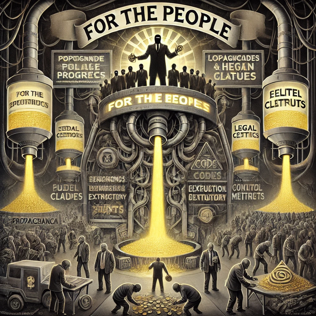 Beneath a glowing slogan, “For the People,” shadowy leaders preside over a sophisticated extraction system. Golden siphons drain wealth, labor, and vitality from the gray-toned masses below, funneled into the vaults of faceless elites counting riches. Charts labeled “Control Metrics” and legal texts with hidden clauses surround the elite, who operate from behind ceremonial façades. The contrast between golden luxury and grim exploitation underscores the parasitic dynamic: a polished illusion concealing systemic depletion.