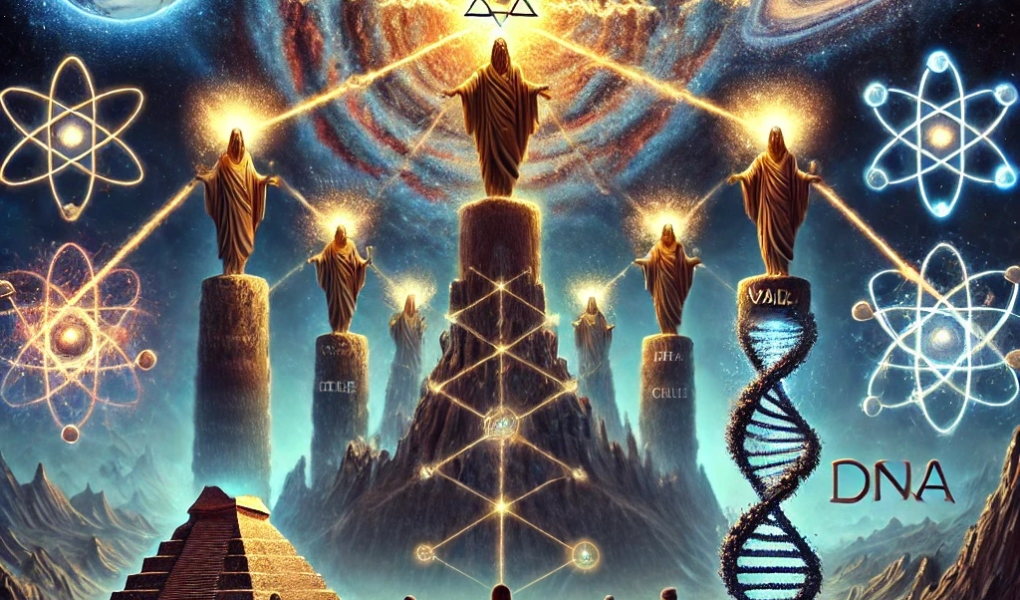 Set against a swirling galactic sky, timeless beings cast structured energies into the world: geometric forms of control, glowing chains, flickering screens, and looming idols. The land below is fragmented, with scattered groups reacting in confusion and division. It’s a dreamlike rendering of unseen forces shaping the evolution of belief, power, and separation.