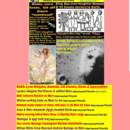 From NINMAH, MOTHER OF HUMANITY by Zecharia Sitchin Student Janet Kira Lessin Click https://wp.me/p1TVCy-5N6 to get way more on this. Backstory: The Anunnaki, Homo sapiens from the planet Nibiru had maintained a transshipment base on Mars for gold ingots from Earth to Nibiru. On Nibiru, the Astronaut Corps refined the ingots to white powder of monoatomic gold and floated it into the …