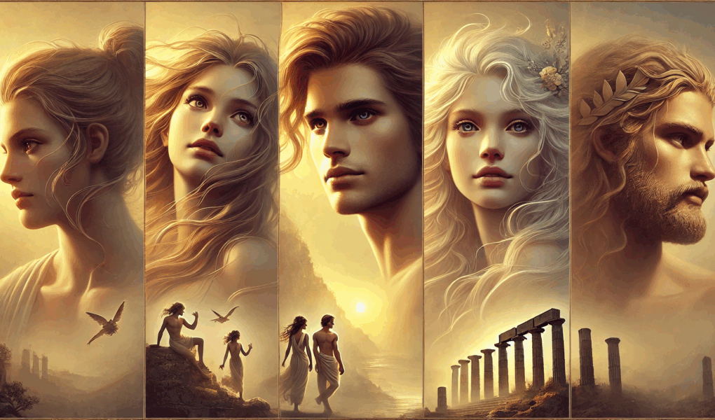 Paris of Troy, Helen of Sparta, Aphrodite, Greek gods, Niad nymph, ancient Troy, divine love, prophecy, epic romance, golden apple, Trojan War, mythic banner, classical mythology, romantic tragedy, Mediterranean myth, mythological art, fate and destiny, love triangle, myth-inspired illustration