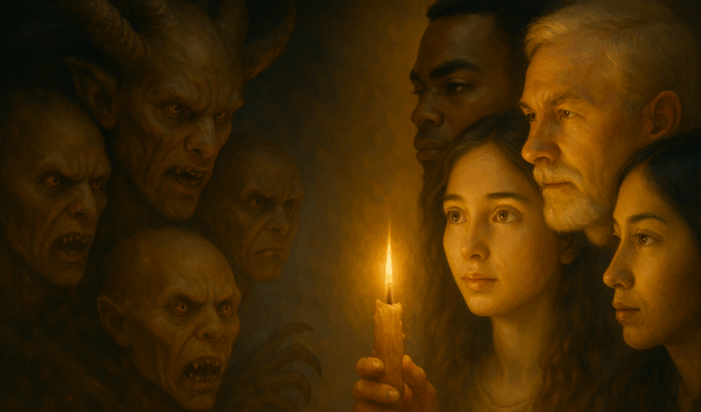 A small flame pierces the darkness as humanity gathers around its fragile glow. Their faces—young and old, of many colors—reflect calm courage, each illuminated by the shared light of hope. Across from them, in the shadows, distorted figures of fear and hatred snarl in frustration, unable to cross the boundary of illumination. The candle becomes more than fire; it is the spark of consciousness itself, proving that even the faintest light can hold back the endless night.