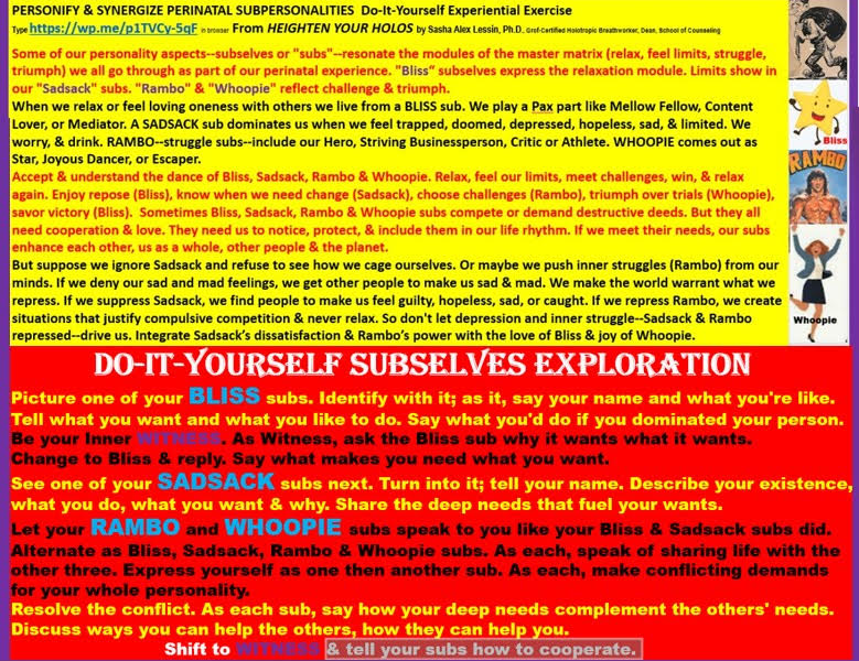 Some of our personality aspects–subselves or “subs”–resonate the modules of the master matrix (relax, feel limits, struggle, triumph) we all go through as part of our perinatal experience. “Bliss“ subselves express the relaxation module. Limits show in our “Sadsack” subs. “Rambo” & “Whoopie” reflect challenge & triumph.