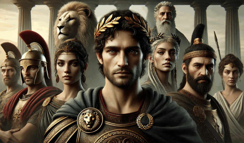 Three generations of power: Philip, Alexander, and a Macedonian general face the viewer head-on. Their eyes tell of conquest, burden, and the heavy clarity of rule. The image captures the masculinity of empire—measured, resolute, and honest.