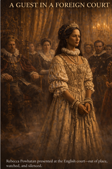DESCRIPTION: Rebecca Powhatan presented at the English court—out of place, watched, and silenced.