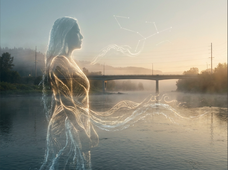 IMAGE PROMPT: A symbolic cinematic image of a translucent Native American woman’s figure blending into a modern river landscape. Subtle light patterns suggest ancestry and continuity. Mood: timeless, reverent, hopeful. Style: realistic, photorealistic, cinematic lighting, soft natural colors, fantasy realism, emotional depth. Landscape.