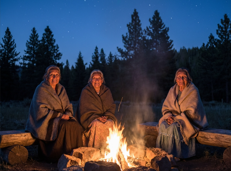IMAGE PROMPT: A serene cinematic scene of elder Native American women seated near a fire at dusk, their faces illuminated by warm light. Their expressions convey wisdom, compassion, and strength. Forest and stars in the background. Style: realistic, photorealistic, cinematic lighting, soft natural colors, highly detailed, emotional depth. Landscape.